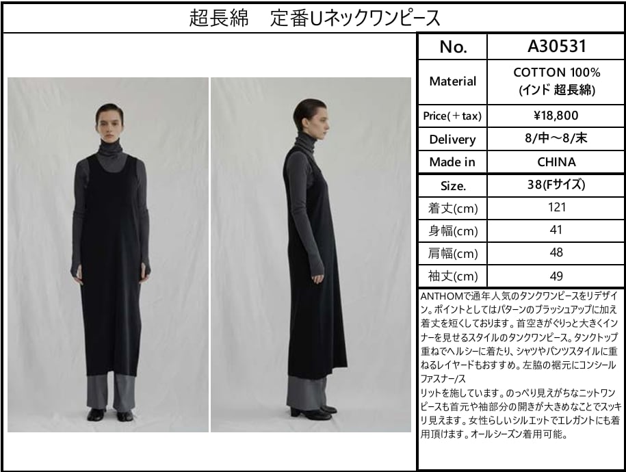 【ご予約品】《ANTHOM》超⻑綿 定番Uネックワンピース [A30531]【送料無料】 納期 8/中〜8/末