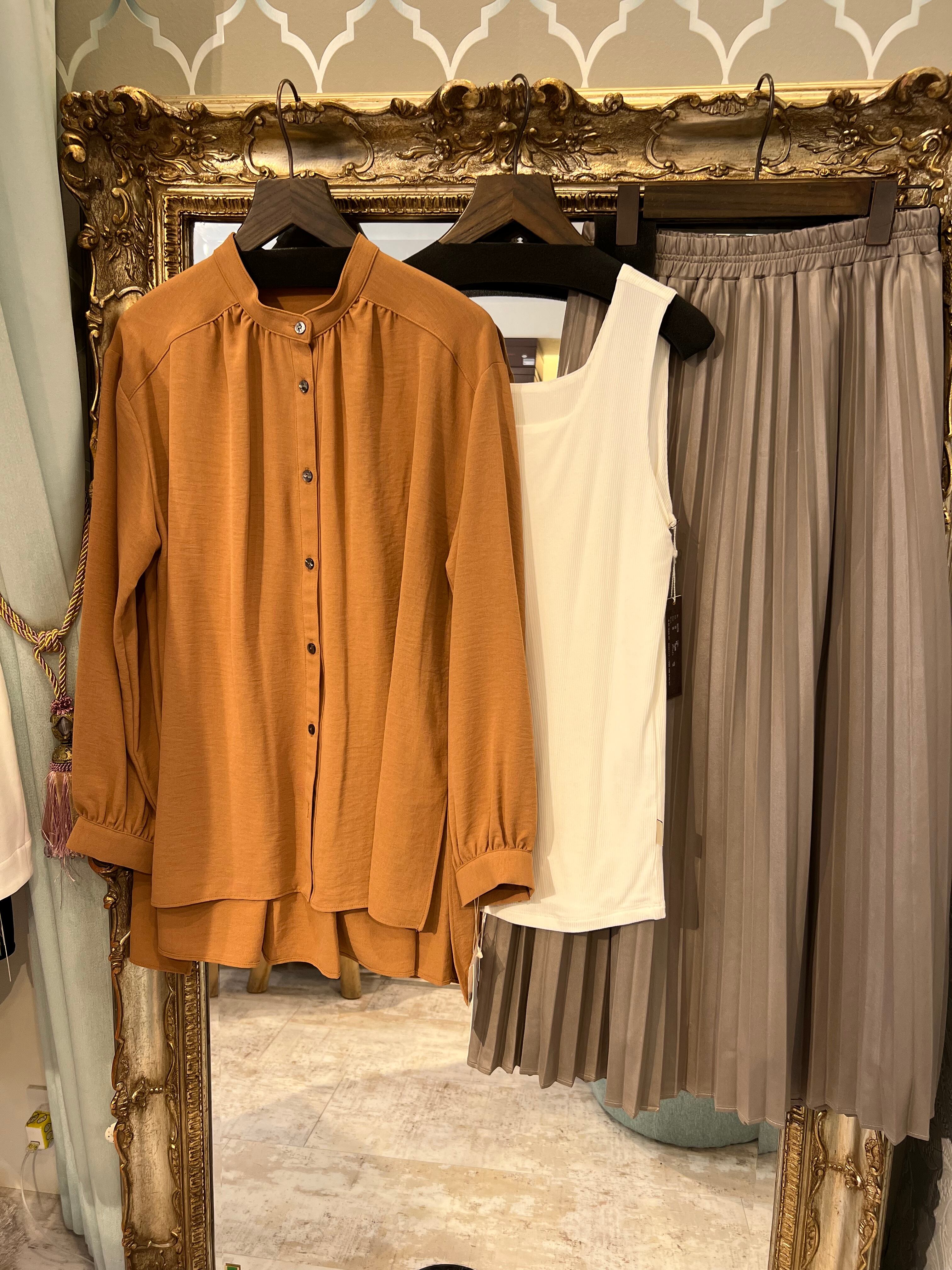 『M・K』様専用《エピデミーク》後ろギャザーブラウス41オレンジ プリーツスカート6:モカ《ayane》スクエアリブタンク.オフ白